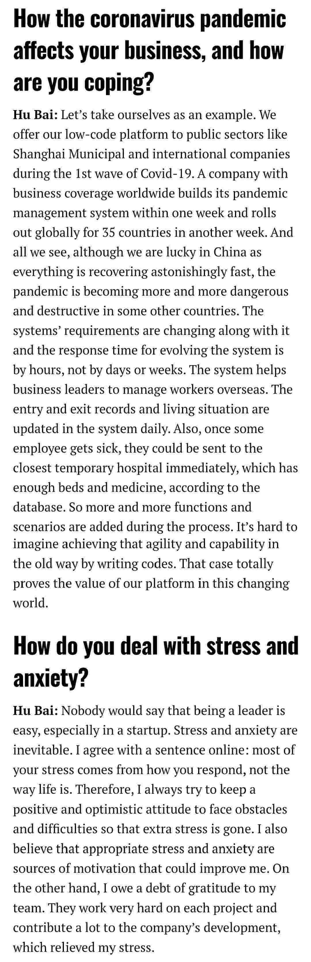 2021年年初,,,,,,,,,,,,爱湃斯科技CEO胡柏受邀接受法媒Startup.info的专访,,,,,,,,,,,,与Startup info的读者分享了自己的创业经历、、、、、以及低代码平台抖音钱包的创新之处。。。。。。。。。