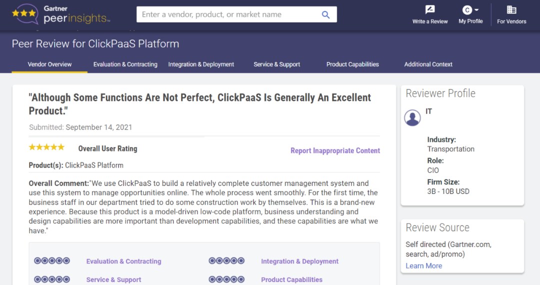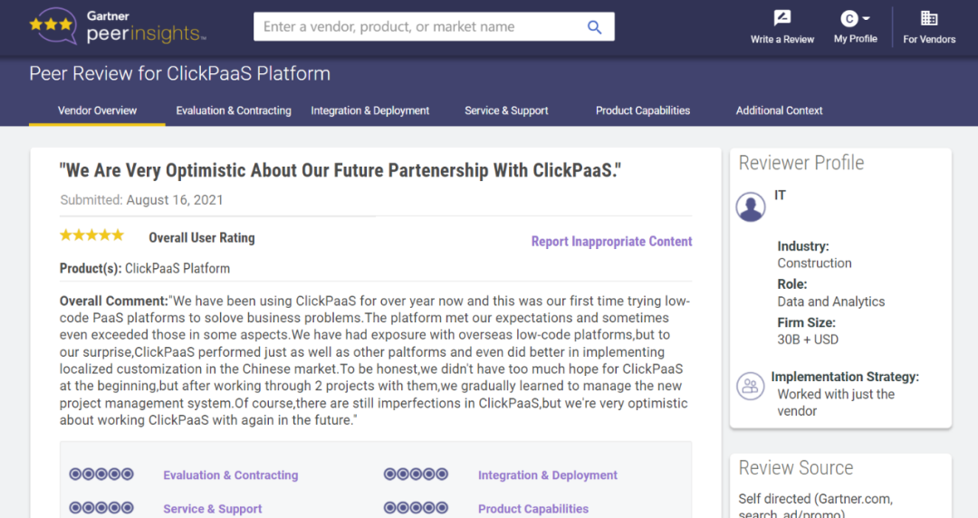 Tips:::::::【Peer Insights】——用户对企业IT产品和服务发布真实评价的平台。。。。。。目前已有355个市场,,,,,255,000条经过验证的评价。。。。。。。。。。每一条评价Gartner会针对参评企业营收规模及参评人员信息做验证、、、、、、、、、、、、评价内容做多维核实。。。。。。。。。